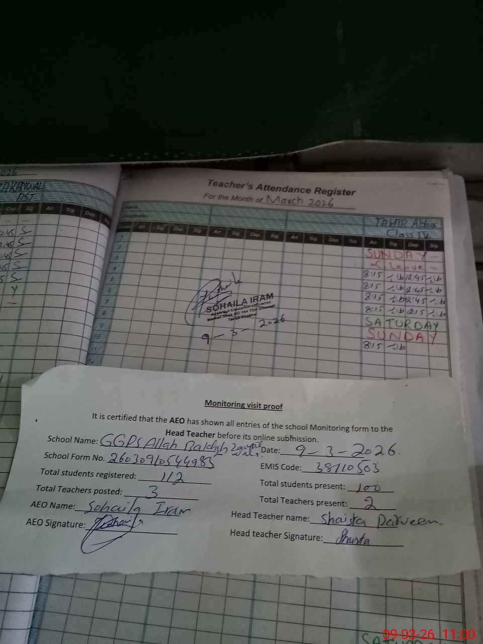 | Attendance Register | Head Teacher | MEA with School | Visit Proof |