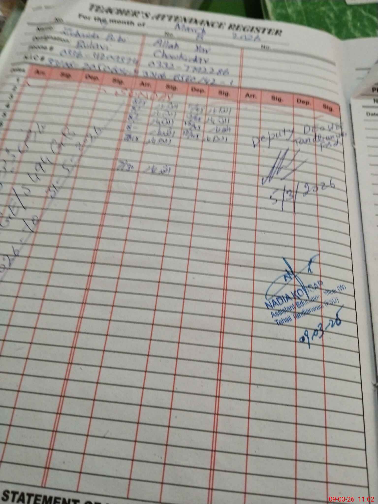 | Name: SA**** BE**** Designation: (School Headmaster's/Headmistress's) EST Phone/Cell Number: 03**** |