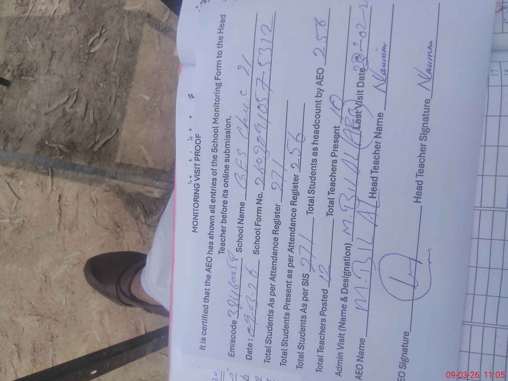 | Attendance Register | Head Teacher | MEA with School | Visit Proof |