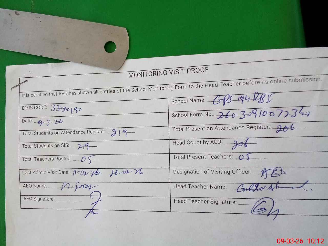 | Attendance Register | Head Teacher | MEA with School | Visit Proof |