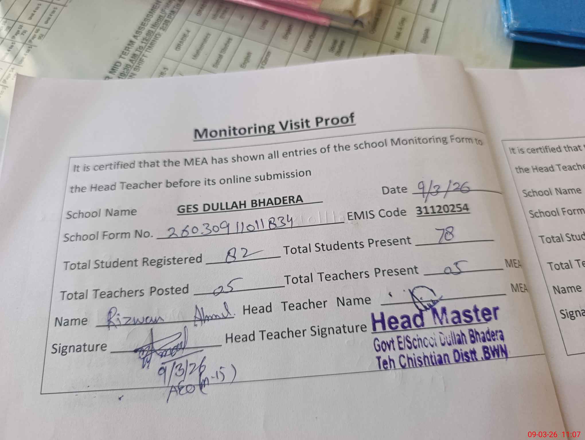 | Attendance Register | Head Teacher | MEA with School | Visit Proof |