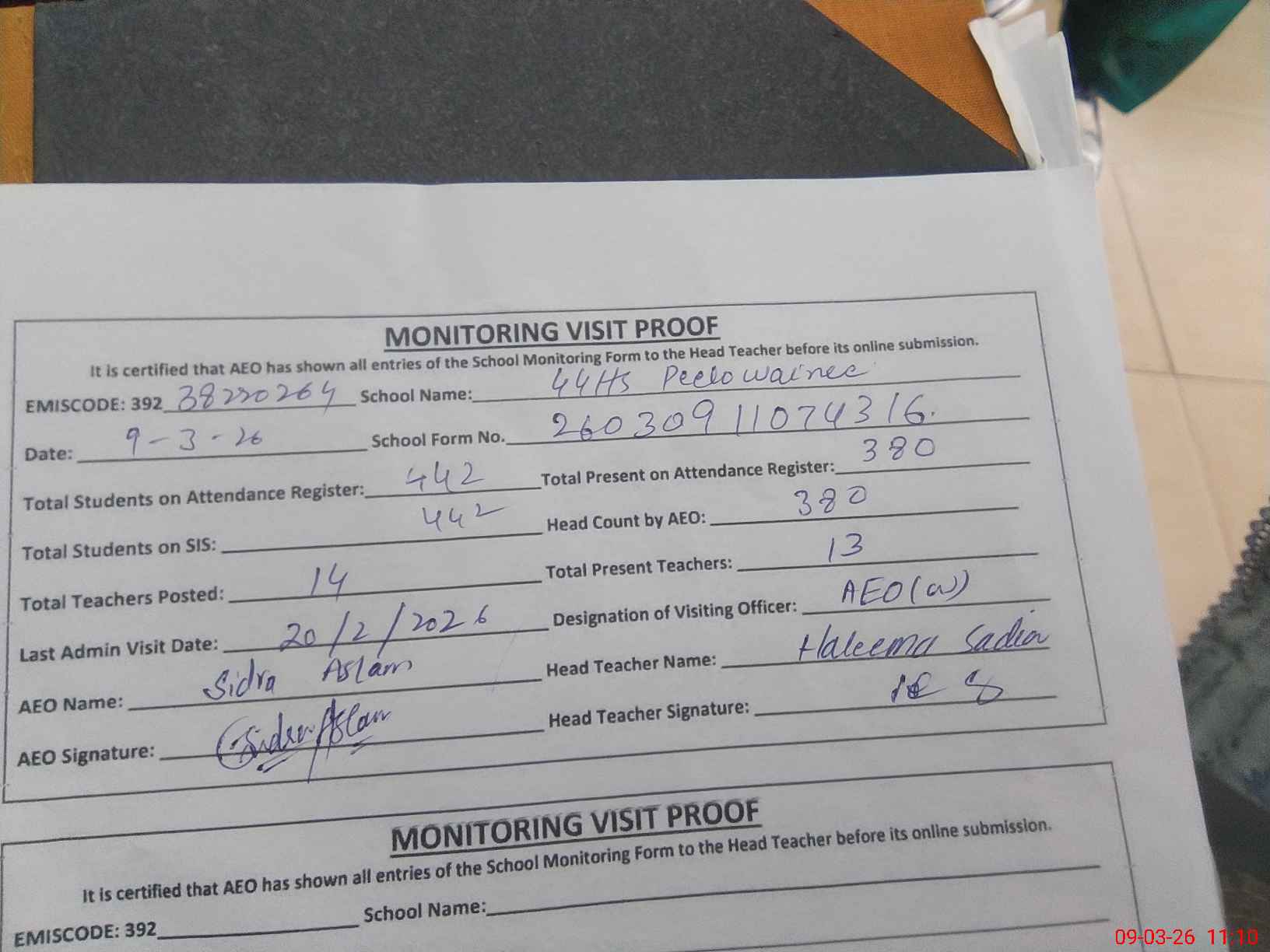 | Attendance Register | Head Teacher | MEA with School | Visit Proof |