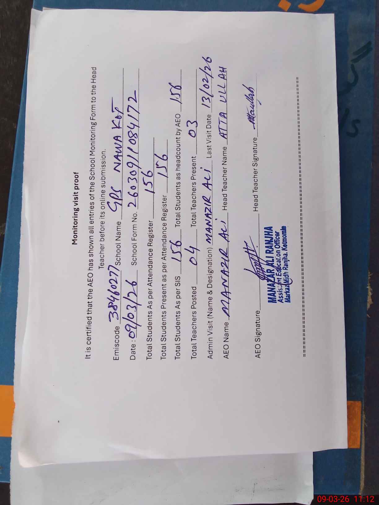 | Attendance Register | Head Teacher | MEA with School | Visit Proof |
