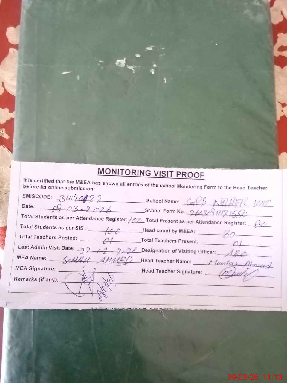 | Attendance Register | Head Teacher | MEA with School | Visit Proof |