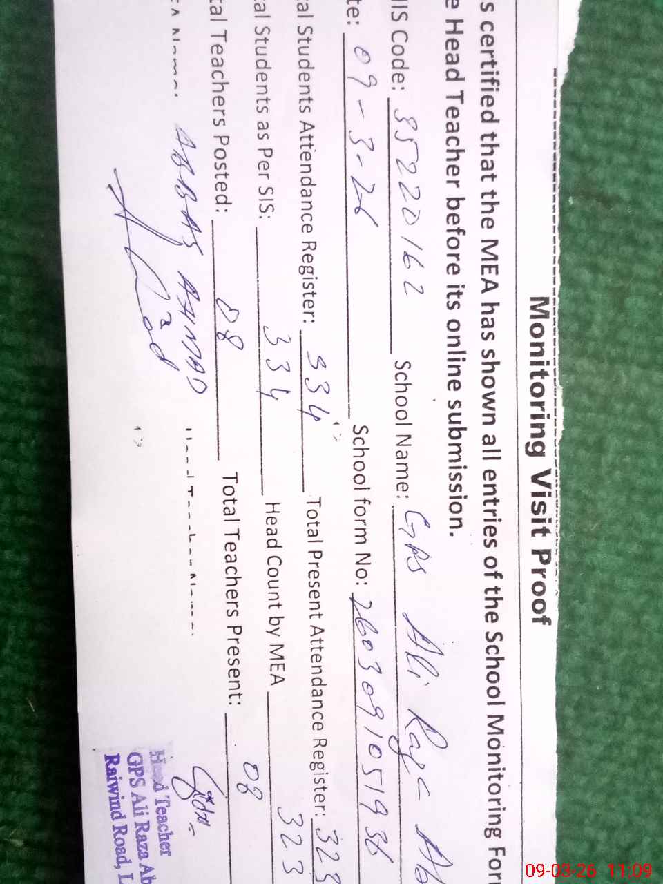 | EMIS Code: 35220162 | Name of School: GPS ALI RAZA ABAD TEHSIL MODEL TOWN | |||