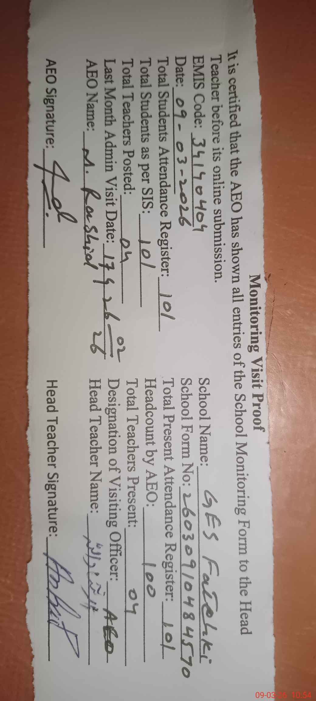 | Attendance Register | Head Teacher | MEA with School | Visit Proof |