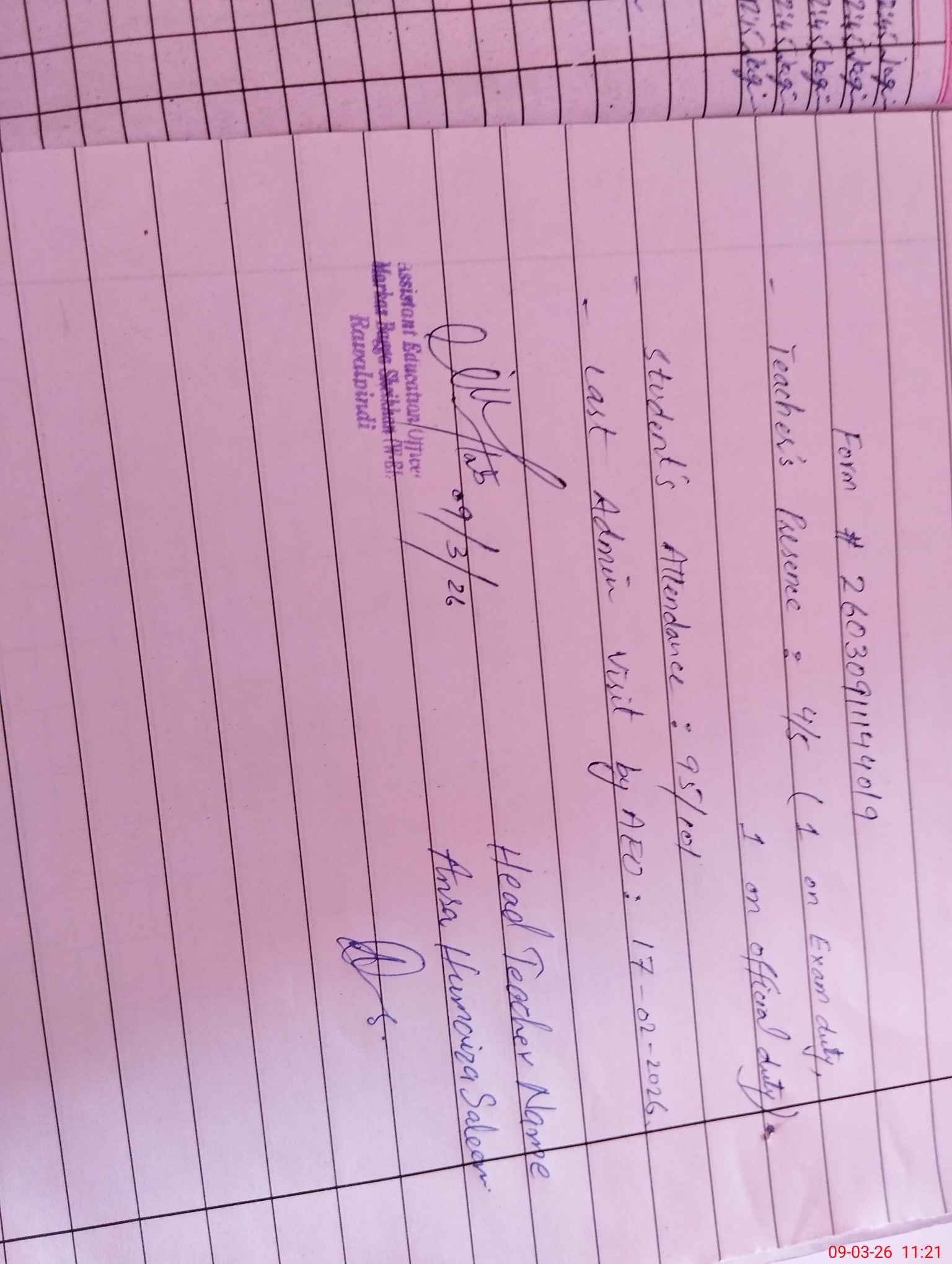 | Name: An**** Hu**** Sa**** Designation: (School Headmaster's/Headmistress's) PST Phone/Cell Number: 03**** |
