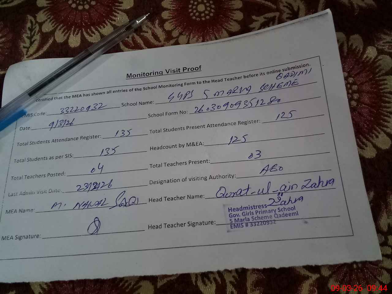| EMIS Code: 33220932 | Name of School: GGPS 5 MARLA SCHEME QADIMI | |||