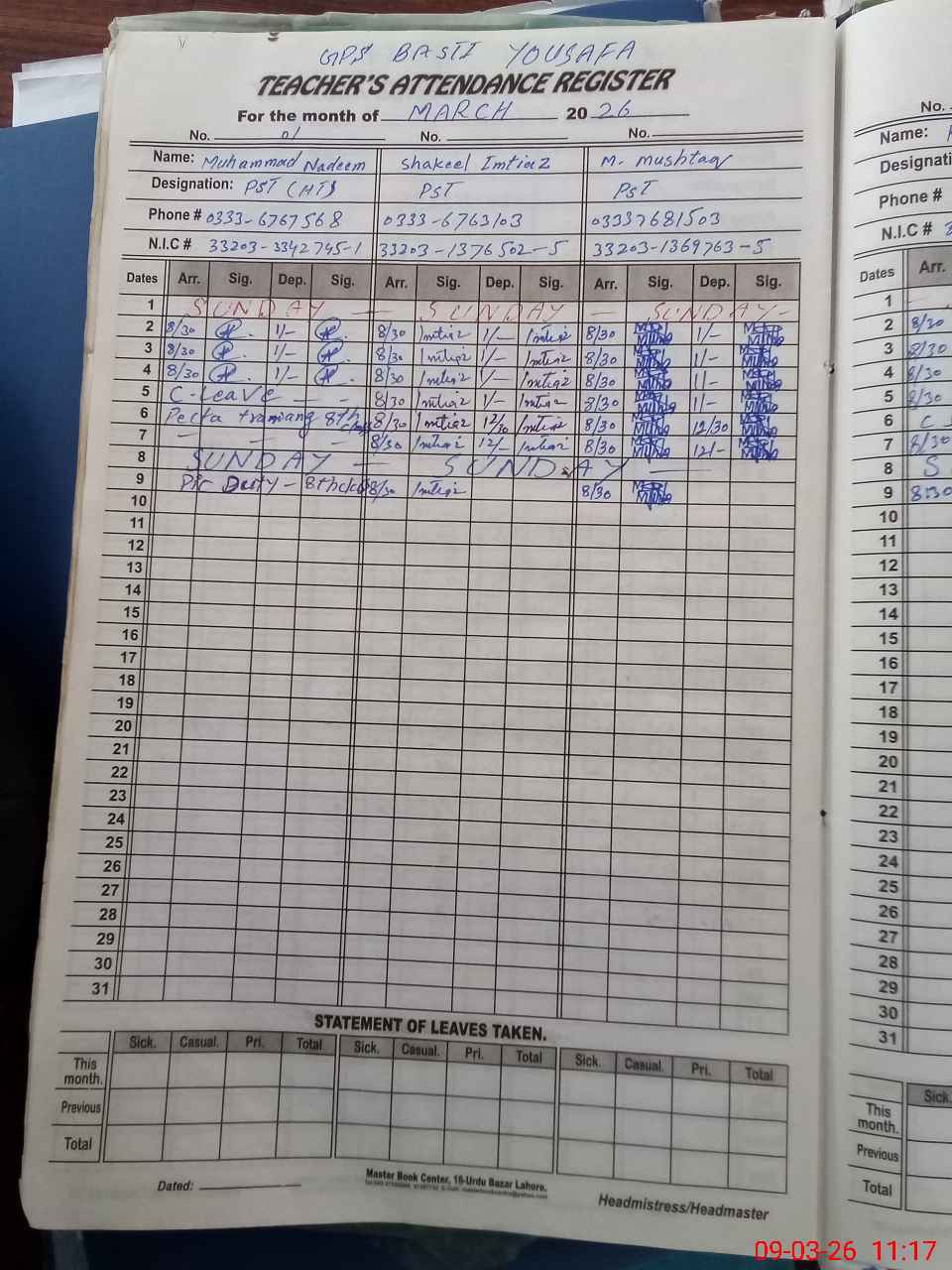 | Name: MU**** NA**** Designation: (School Headmaster's/Headmistress's) PST Phone/Cell Number: 03**** |