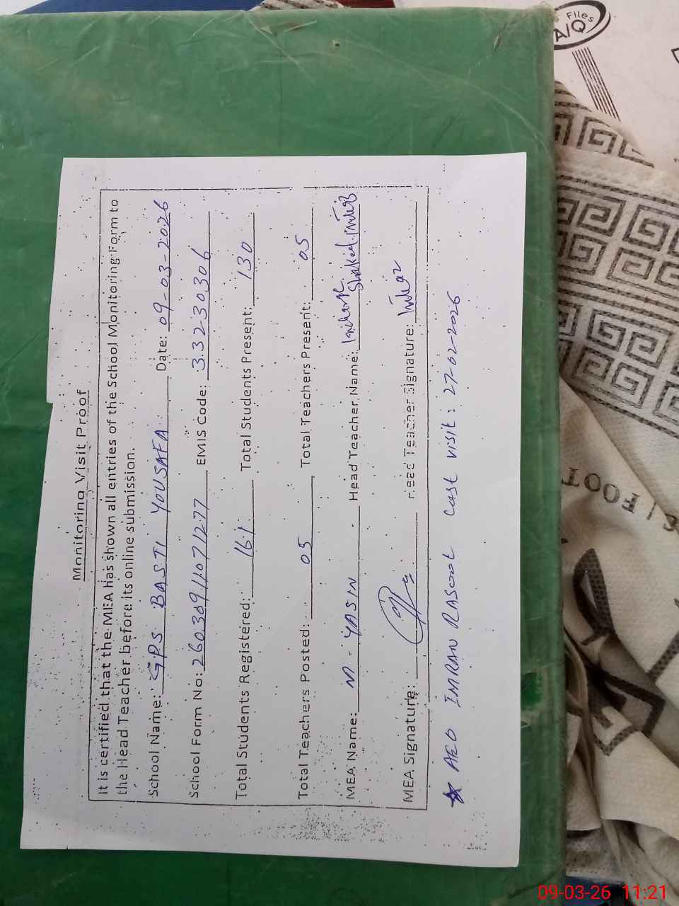| Attendance Register | Head Teacher | MEA with School | Visit Proof |