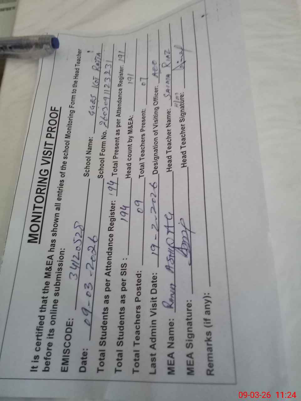 | Attendance Register | Head Teacher | MEA with School | Visit Proof |
