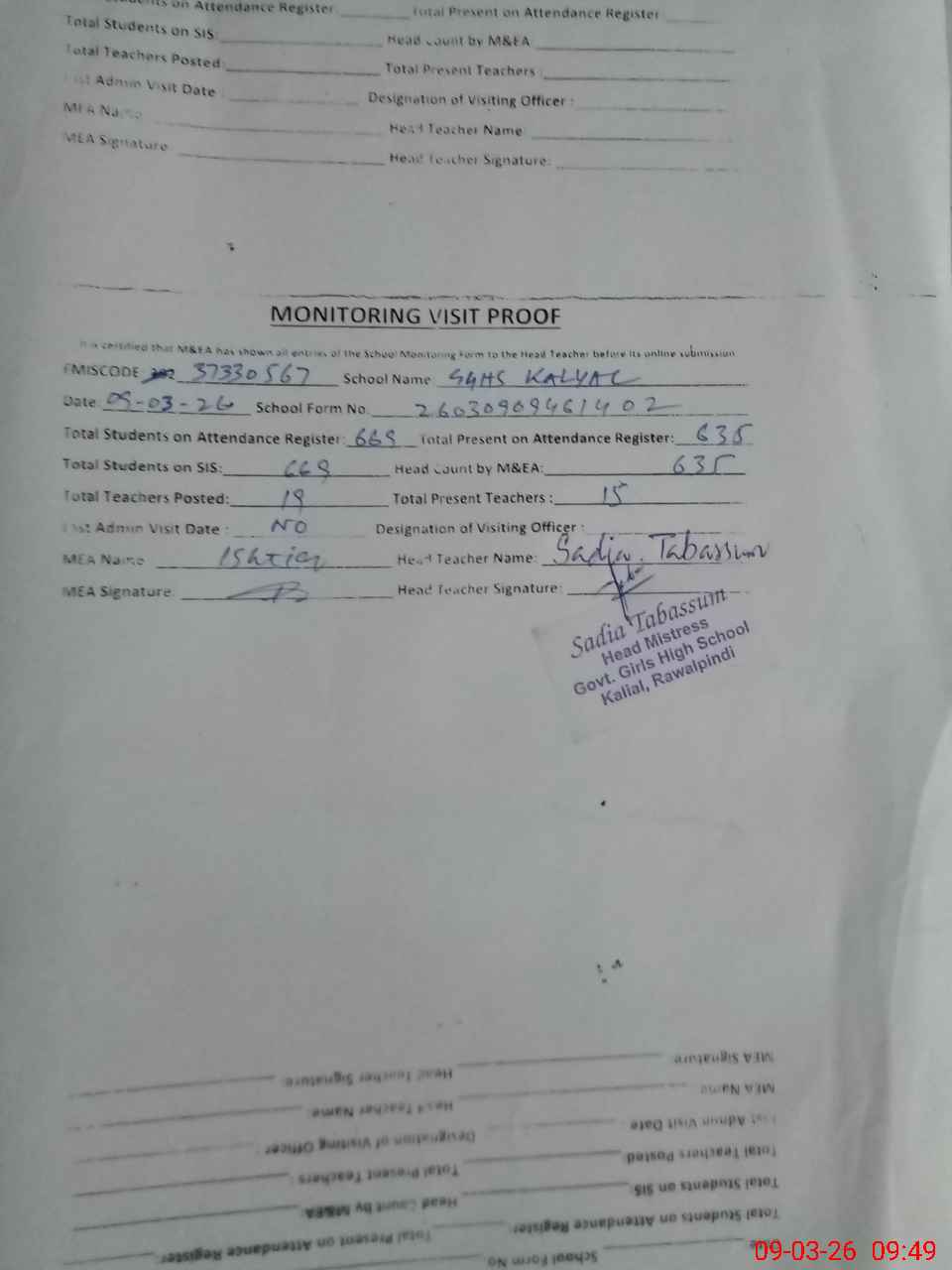 | Certified that this School was Inspected by the Undersigned MEA/DMO Today and the Information Stated Above is as Per Record. | |||||