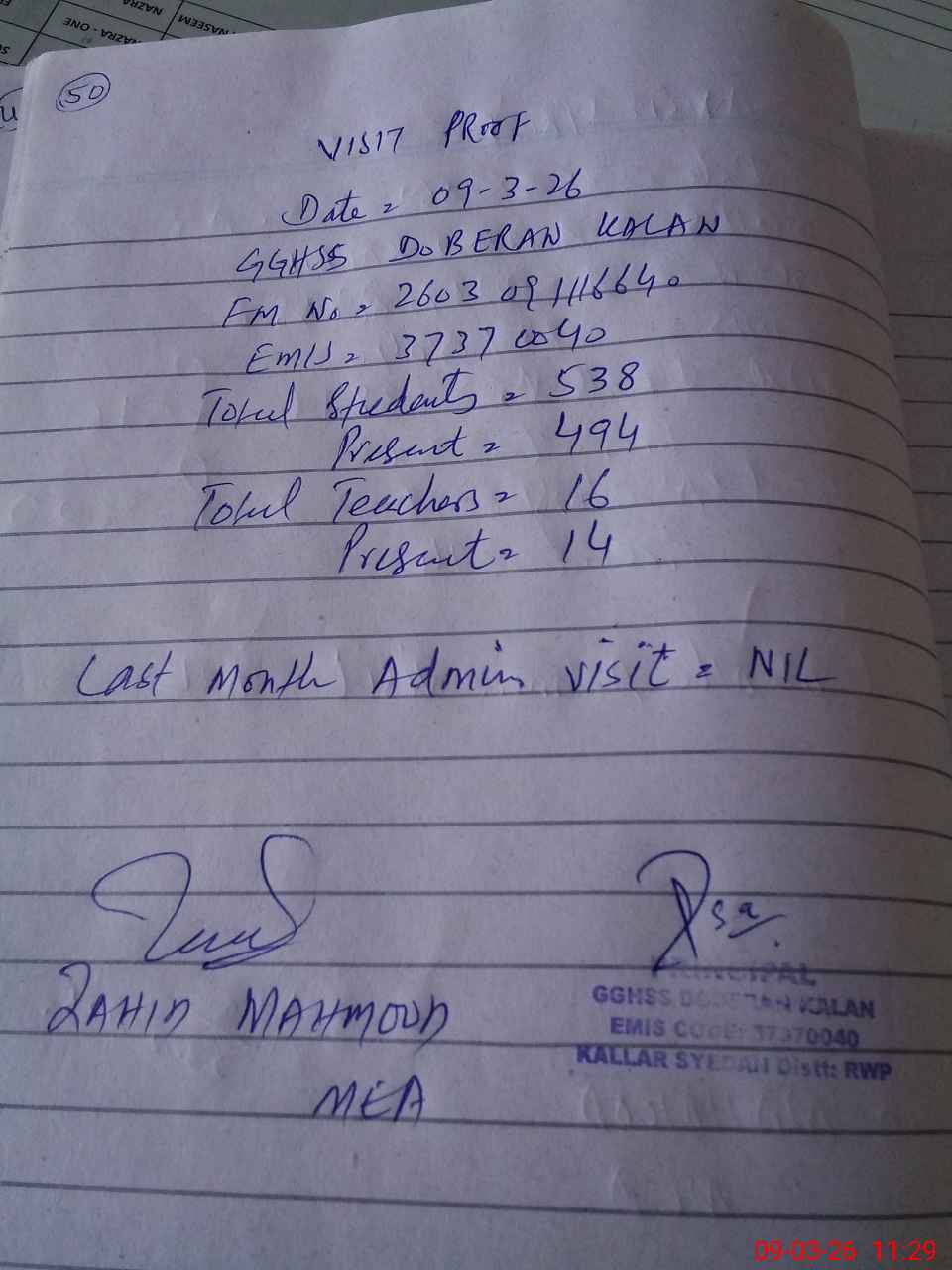 | Certified that this School was Inspected by the Undersigned MEA/DMO Today and the Information Stated Above is as Per Record. | |||||