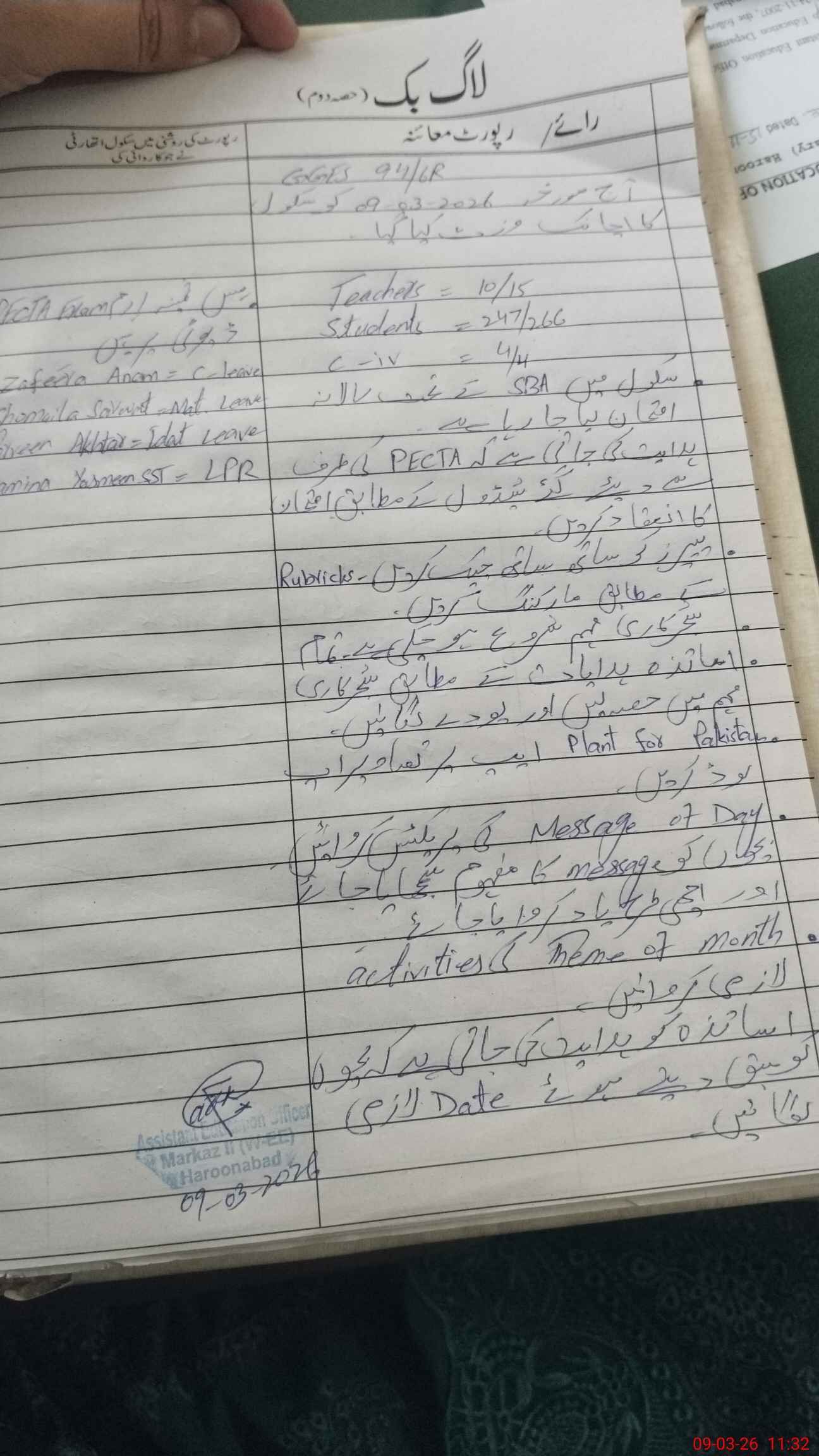 | District: BAHAWALNAGAR | Tehsil: HAROONABAD | Markaz: HND-11-FEMALE | Level: Middle | |