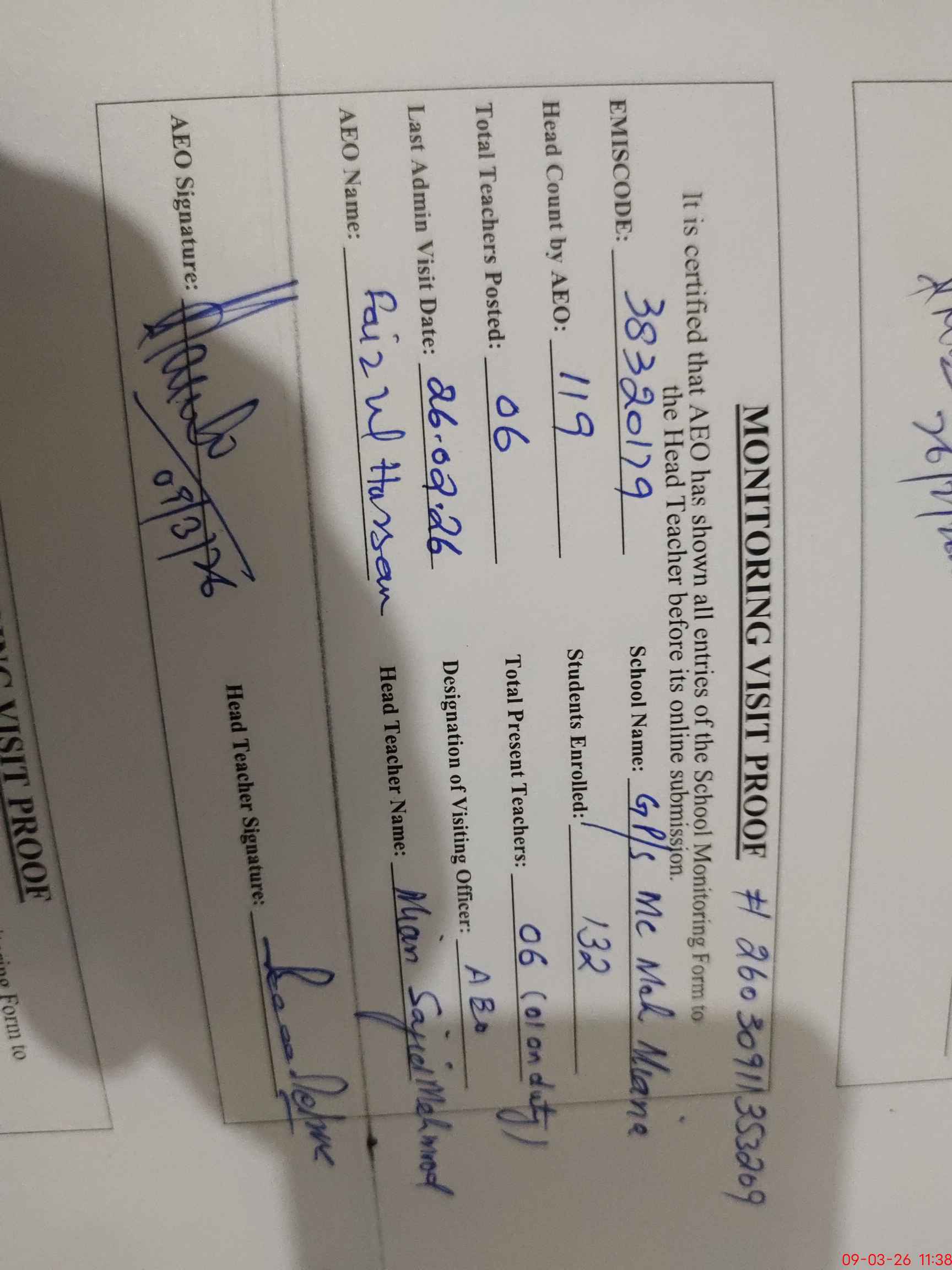 | EMIS Code: 38320179 | Name of School: GPS MC MOHALLAH MIANA | |||