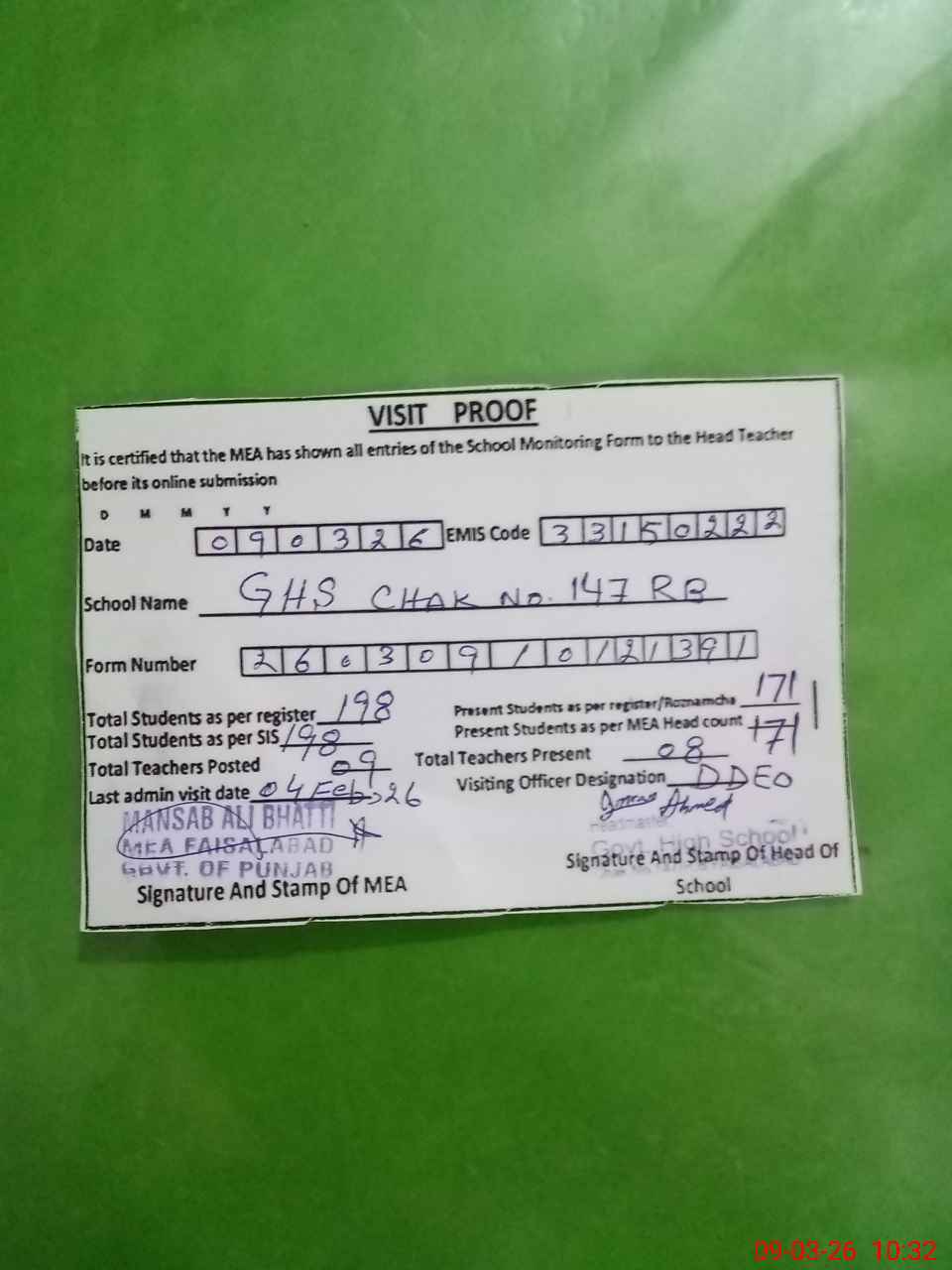 | EMIS Code: 33150222 | Name of School: GHS CHAK 147 RB CHAK JHUMRA FSD | |||
