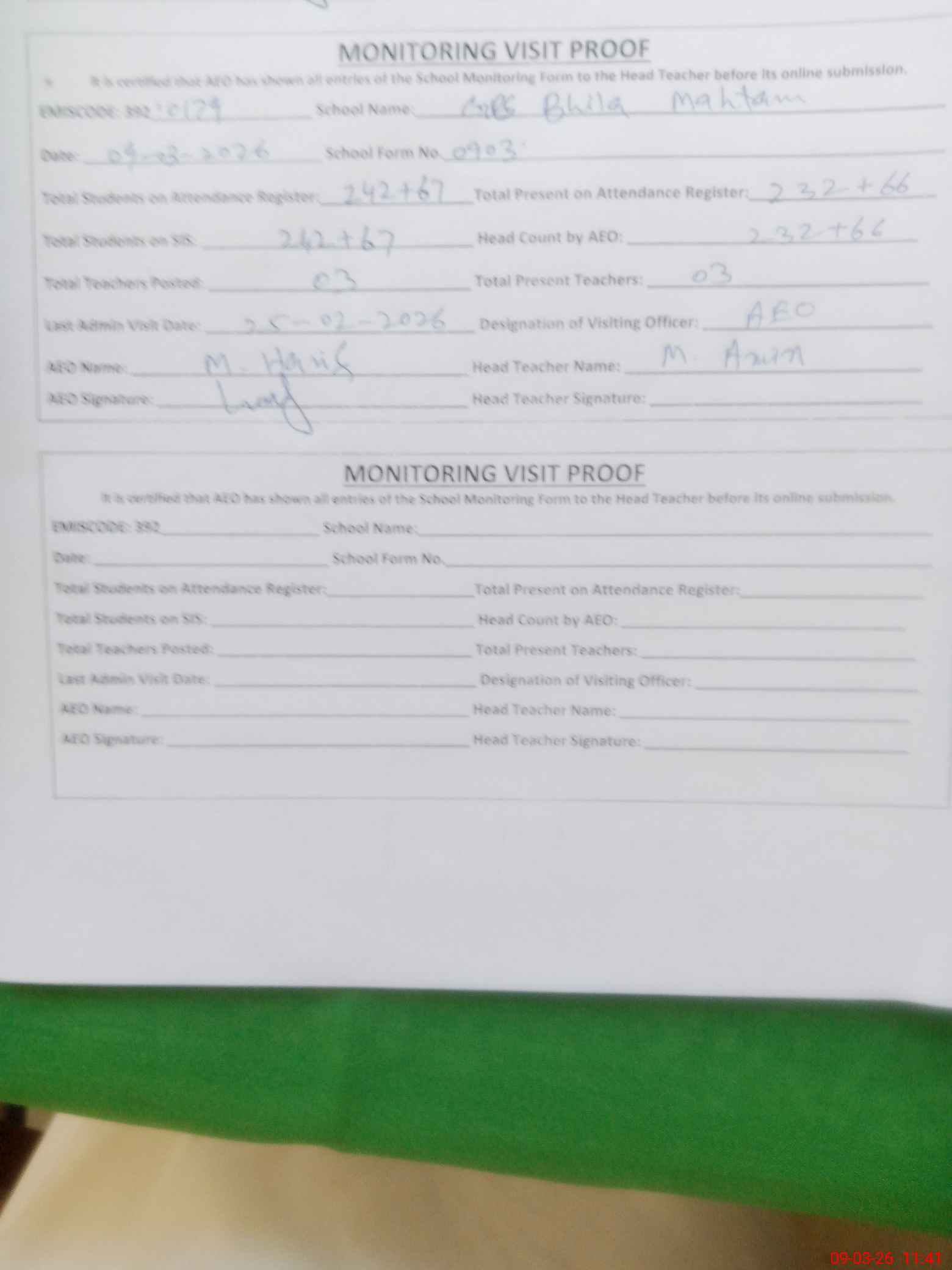 | Monitoring Date: 09-03-2026 | Start Time: 09-03-2026 11:31 AM | End Time: 09-03-2026 11:43 AM | Name of MEA: Mu**** Ha**** | |