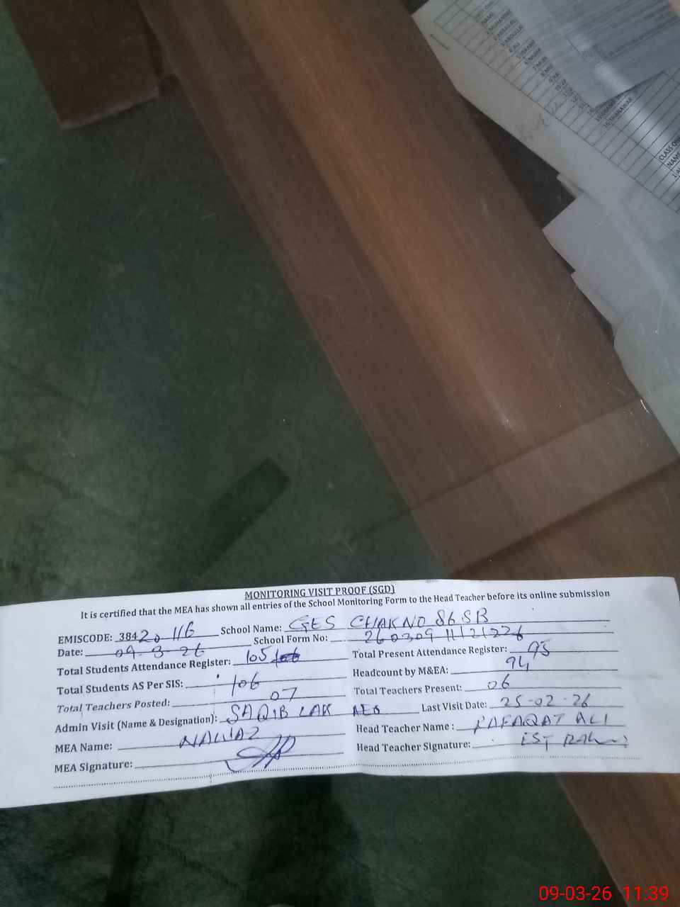 | Attendance Register | Head Teacher | MEA with School | Visit Proof |