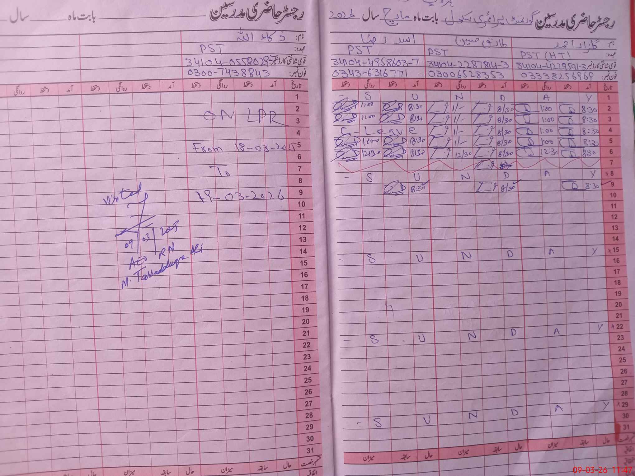 | Name: Ta**** Hu**** Designation: (School Headmaster's/Headmistress's) PST/PTC/JV Phone/Cell Number: 03**** |
