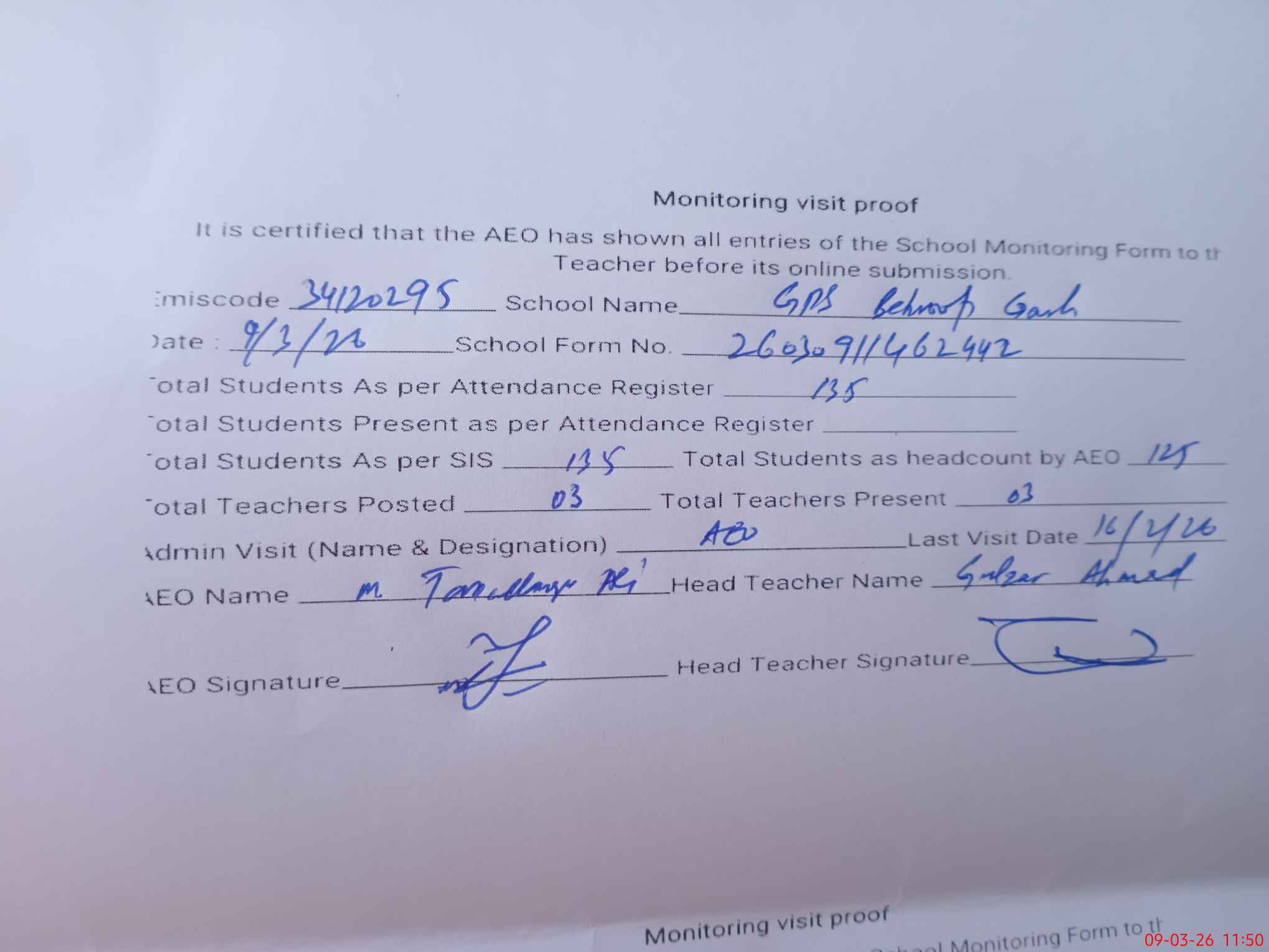 | Attendance Register | Head Teacher | MEA with School | Visit Proof |
