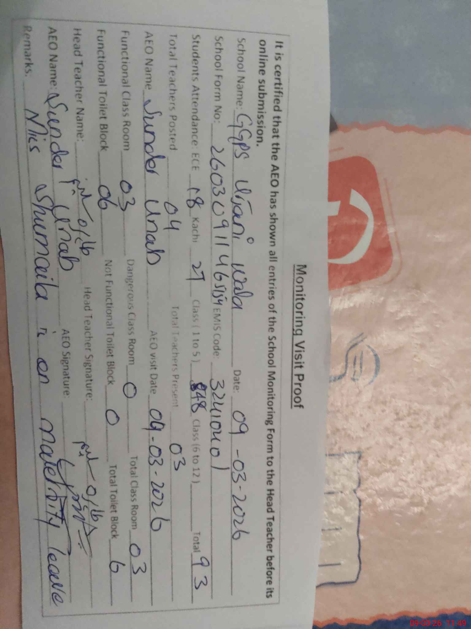 | Attendance Register | Head Teacher | MEA with School | Visit Proof |