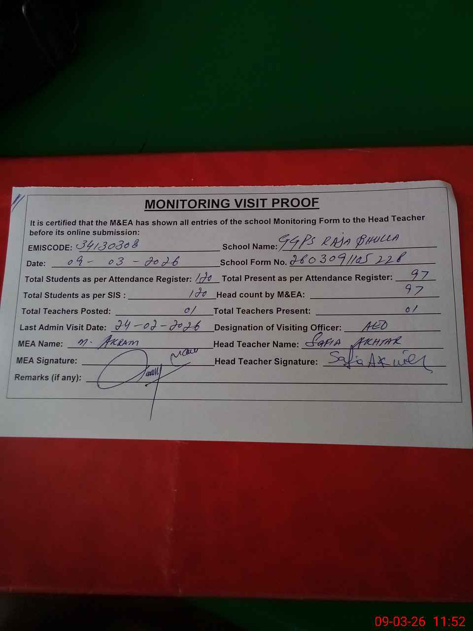 | Attendance Register | Head Teacher | MEA with School | Visit Proof |