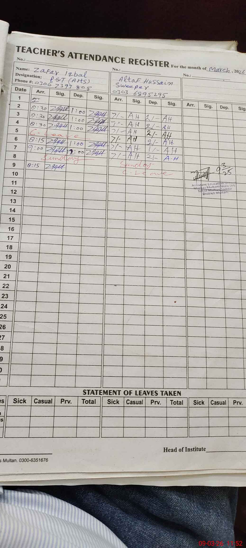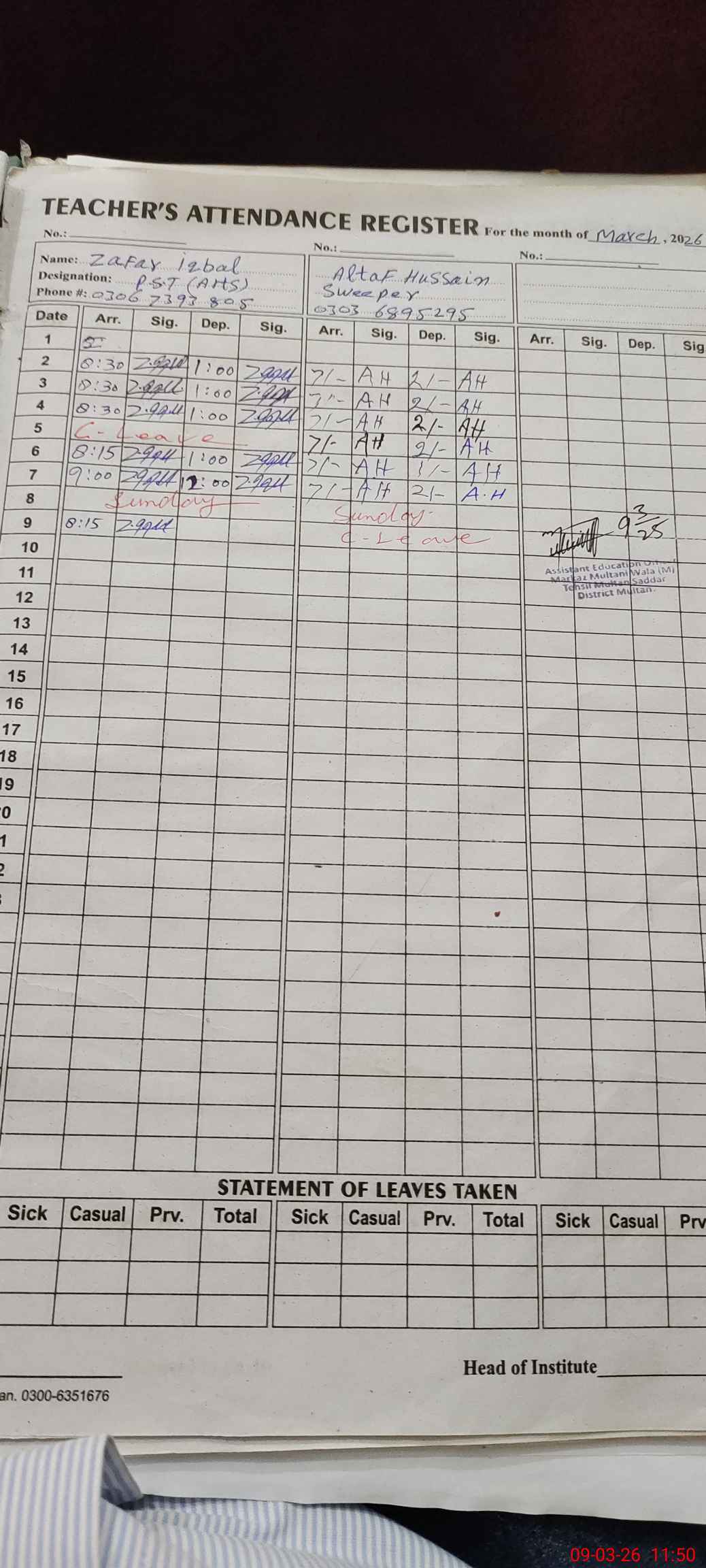 | Name: ZA**** IM**** Designation: (School Headmaster's/Headmistress's) HEADMASTER. SST Arts Phone/Cell Number: 03**** |