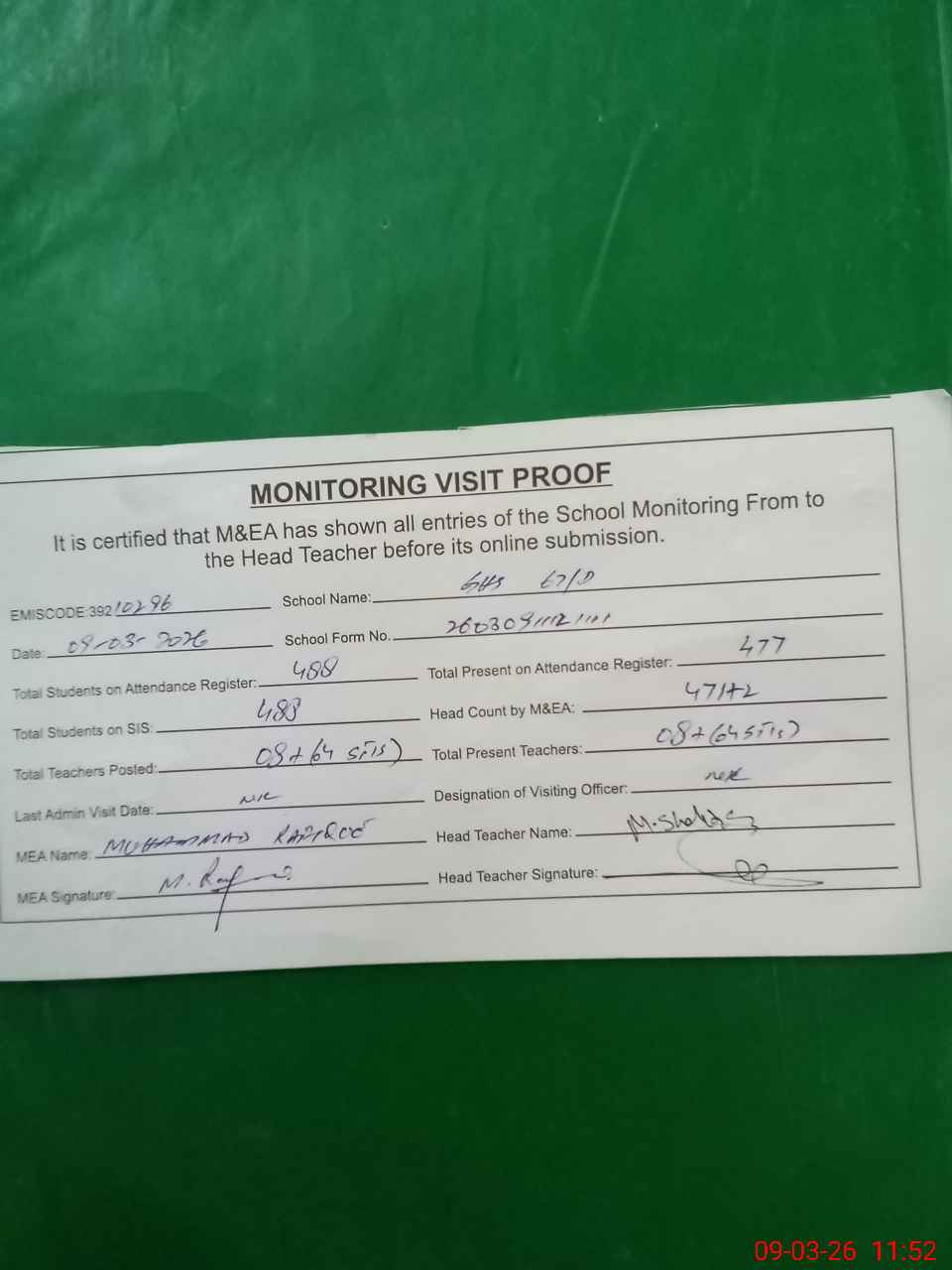 | Attendance Register | Head Teacher | MEA with School | Visit Proof |