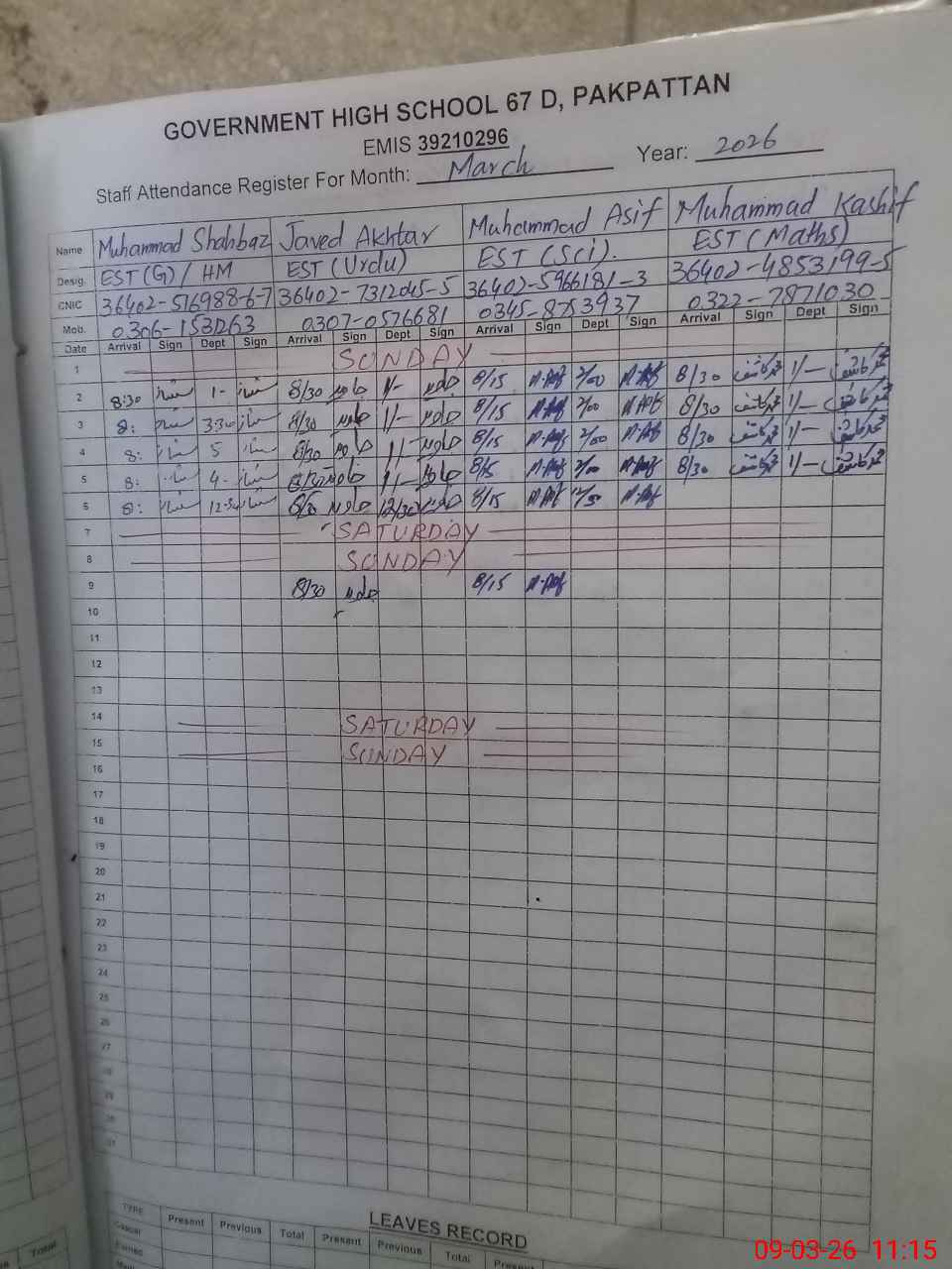 | Name: Mu**** Sh**** Designation: (School Headmaster's/Headmistress's) EST Phone/Cell Number: 03**** |