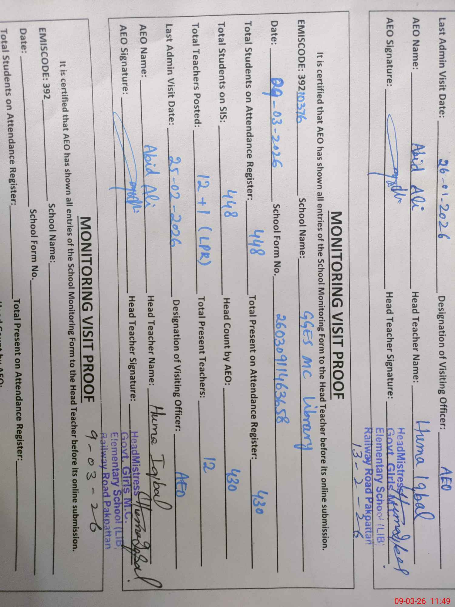 | Monitoring Date: 09-03-2026 | Start Time: 09-03-2026 11:15 AM | End Time: 09-03-2026 11:56 AM | Name of MEA: Ab**** Al**** | |