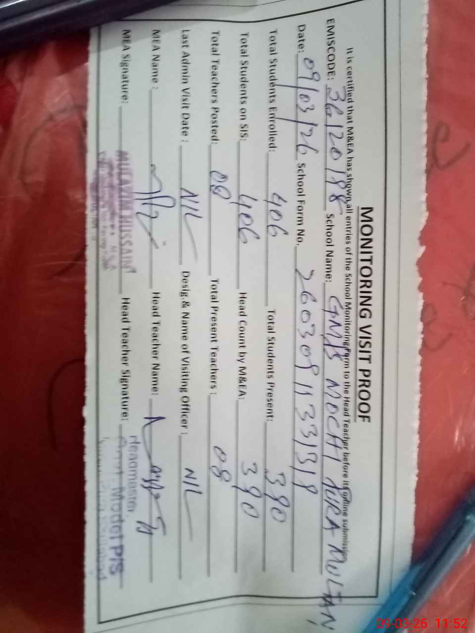 | Attendance Register | Head Teacher | MEA with School | Visit Proof |