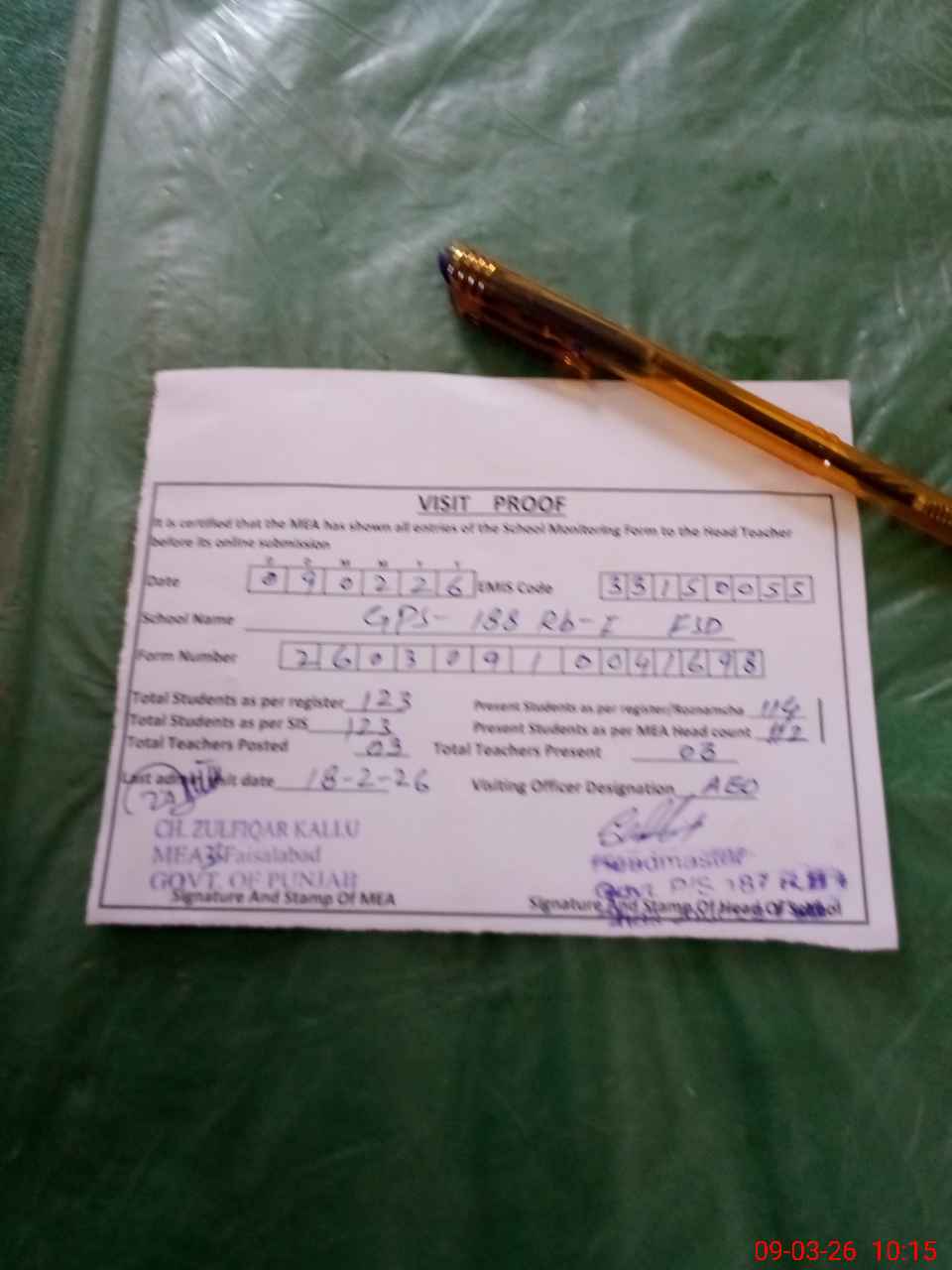 | Attendance Register | Head Teacher | MEA with School | Visit Proof |