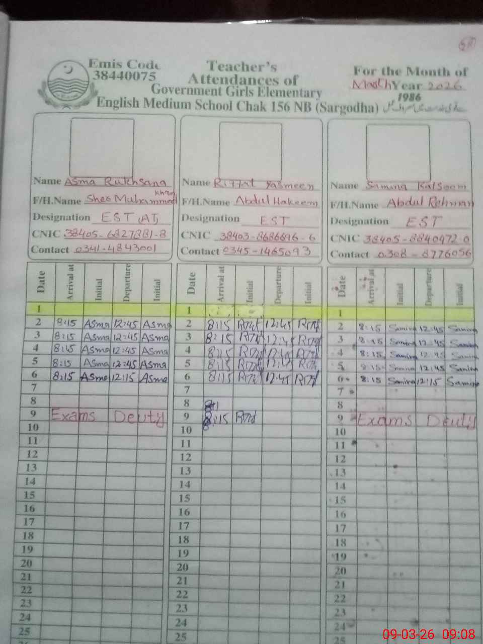 | 38**** | Sa**** Ka**** | EST Urdu | Regular | 0 | 0 | 0 | 0 | 0 | 0 | 0 | 0 | 0 | Exam Duty |