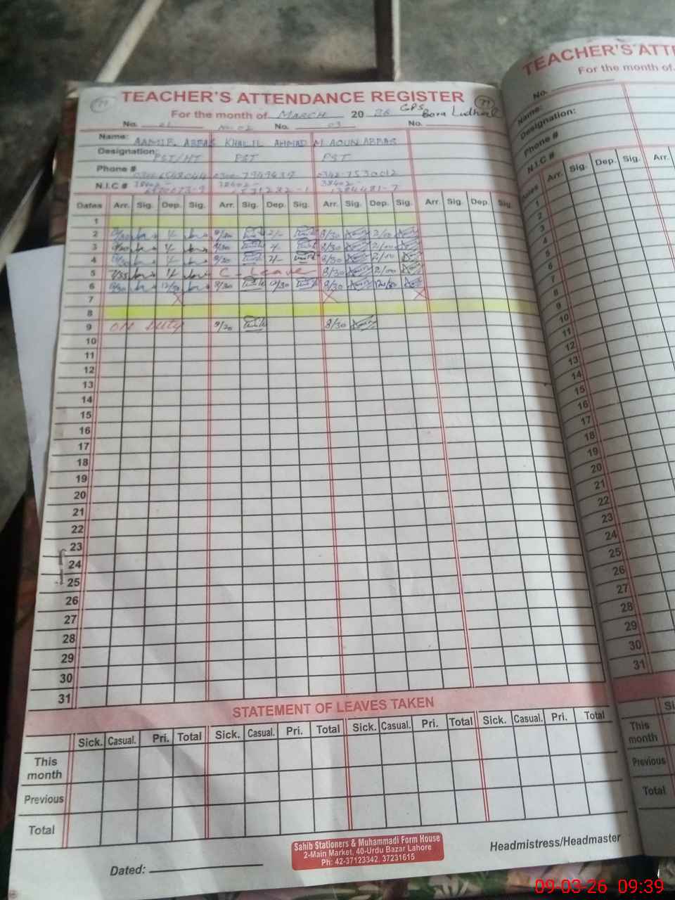 | Name: AA**** AB**** Designation: (School Headmaster's/Headmistress's) PST Phone/Cell Number: 03**** |