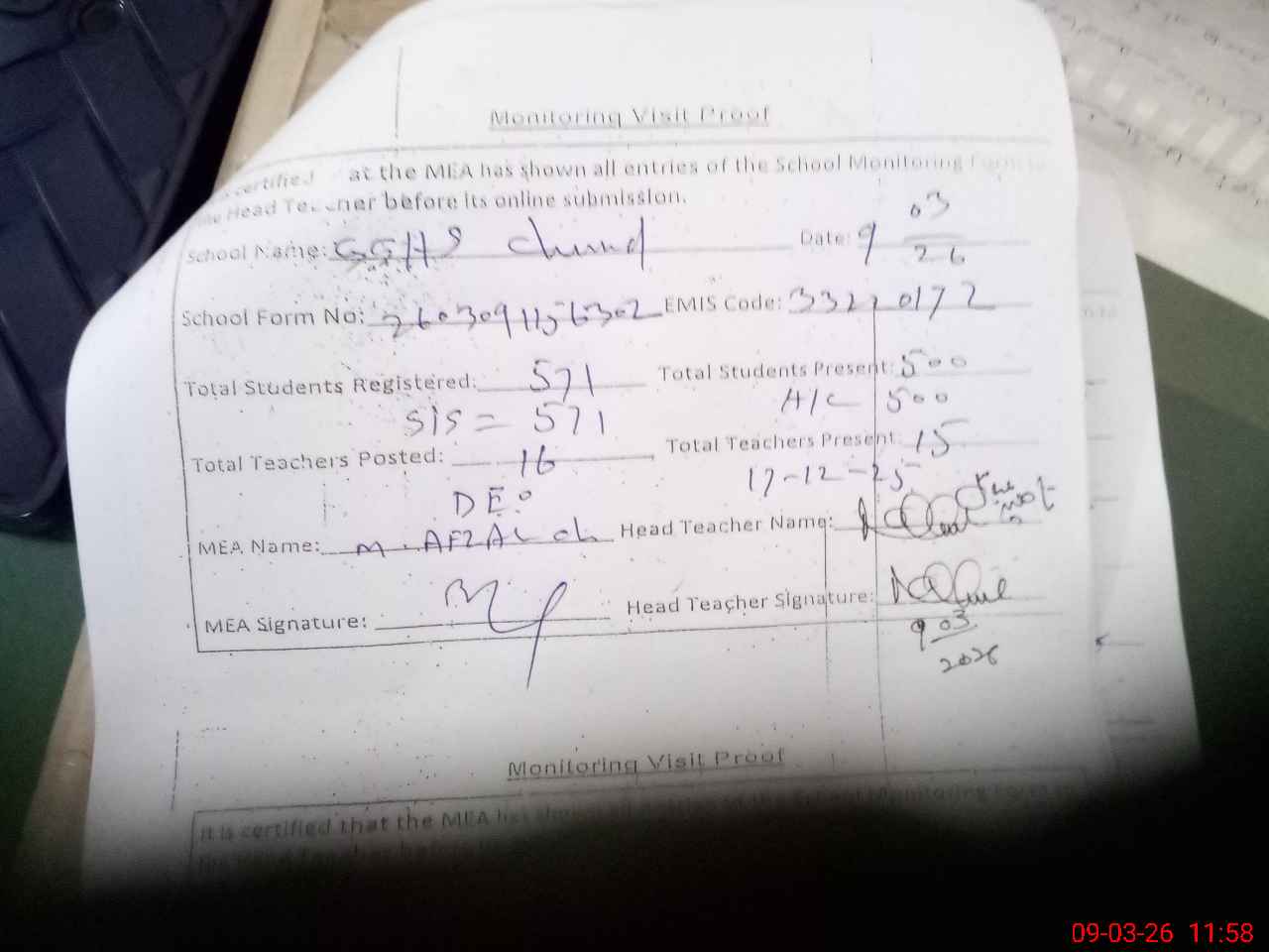 | Attendance Register | Head Teacher | MEA with School | Visit Proof |