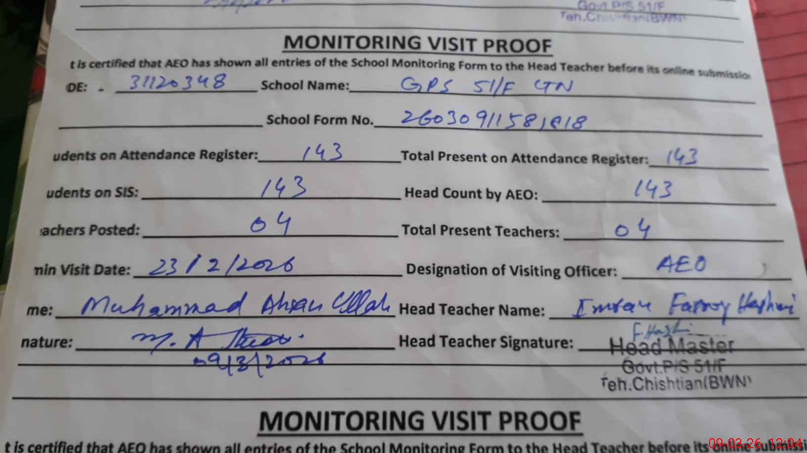 | Attendance Register | Head Teacher | MEA with School | Visit Proof |