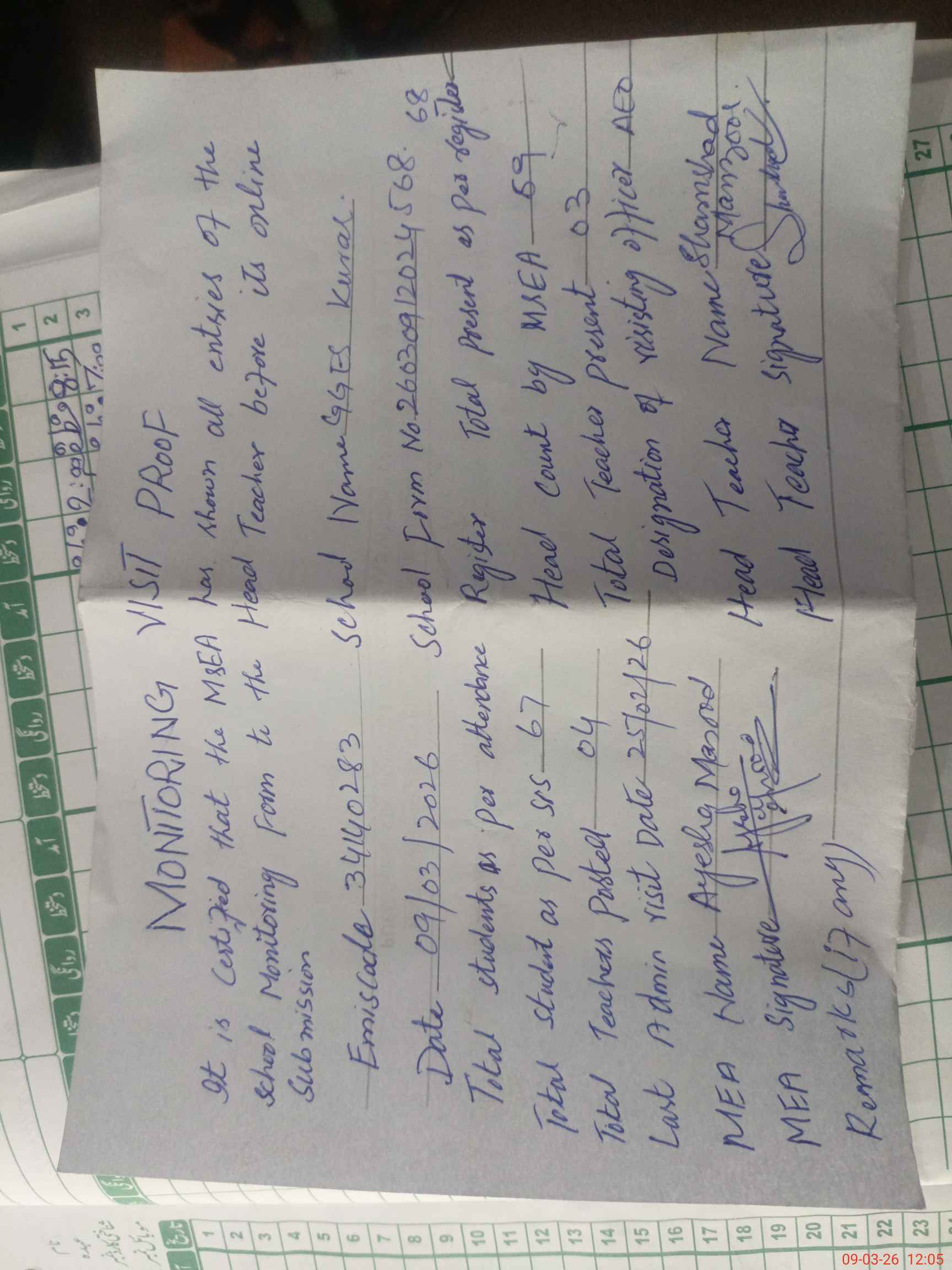 | Monitoring Date: 09-03-2026 | Start Time: 09-03-2026 11:27 AM | End Time: 09-03-2026 12:06 PM | Name of MEA: Ay**** Ma**** Kh**** | |