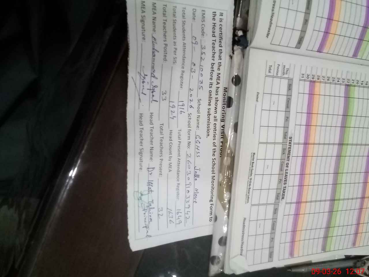 | Attendance Register | Head Teacher | MEA with School | Visit Proof |