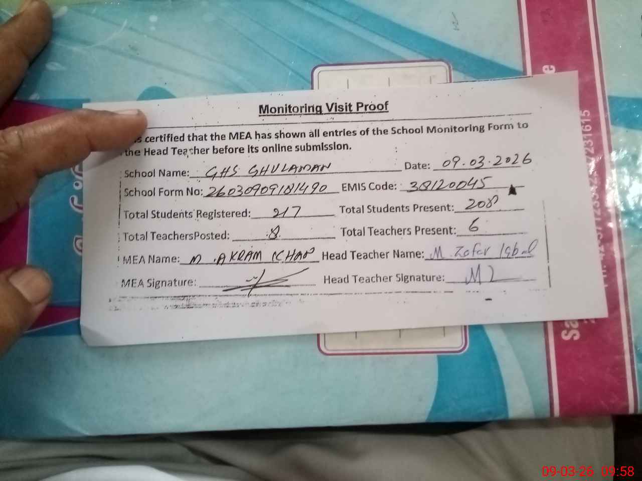 | Attendance Register | Head Teacher | MEA with School | Visit Proof |