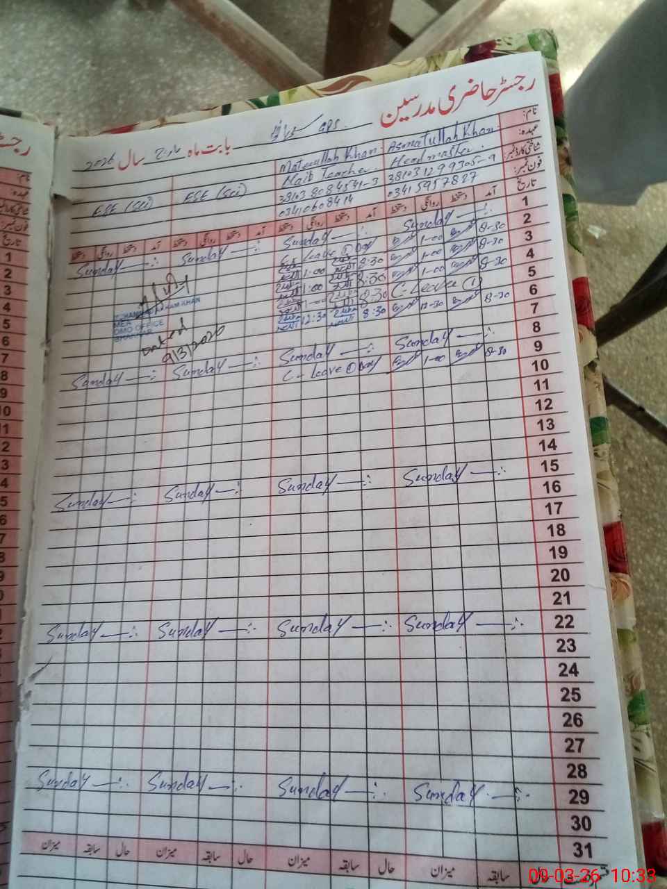 | Total no. of Classrooms: 2 No. of Classrooms Used for Teaching: 2 No. of Classrooms Storing Old Furniture, FTBs, etc: 0Comments if Any: NSB and FTF record not maintain and AEO visit on Log book is 13 February 2026 and teacher attendance register 13 & 23 February 2026 |