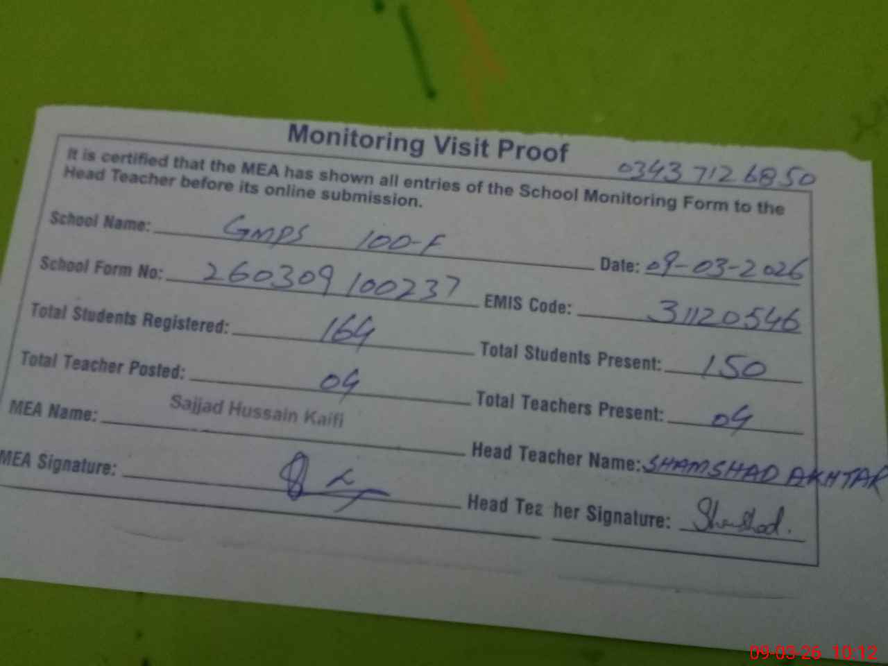 | EMIS Code: 31120546 | Name of School: GMPS CHAK NO 100/F | |||