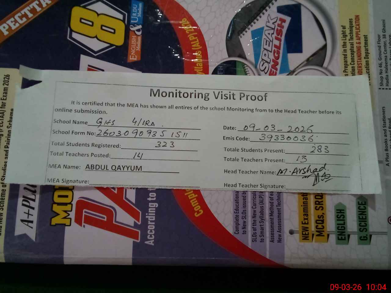 | Attendance Register | Head Teacher | MEA with School | Visit Proof |