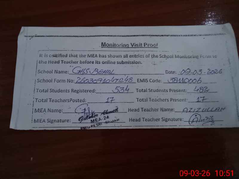 | EMIS Code: 38110006 | Name of School: GHS BEHAL BHAKKAR | |||