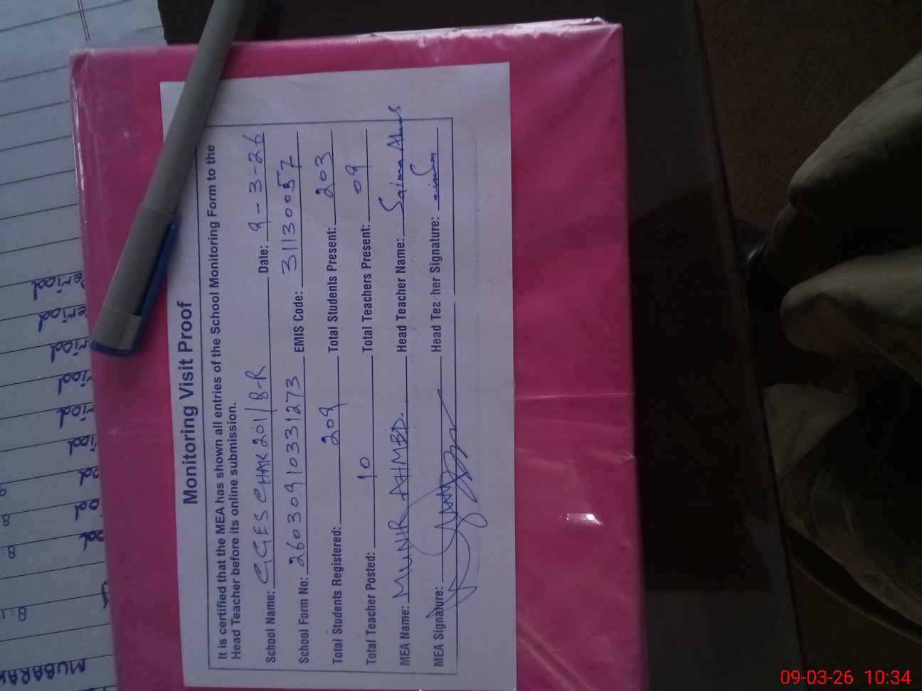 | Attendance Register | Head Teacher | MEA with School | Visit Proof |