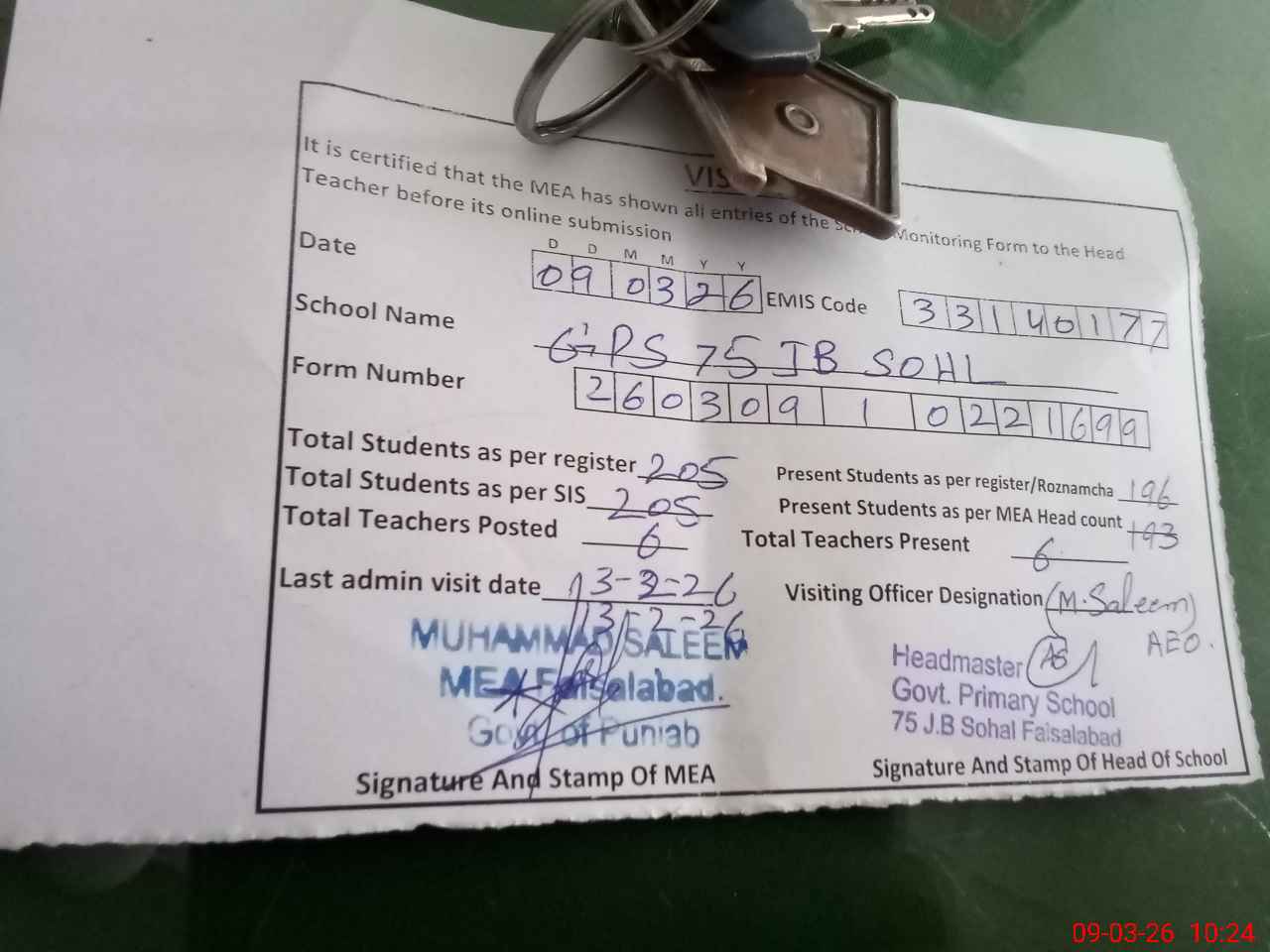 | Name: MU**** AS**** Designation: (School Headmaster's/Headmistress's) PST Phone/Cell Number: 03**** |