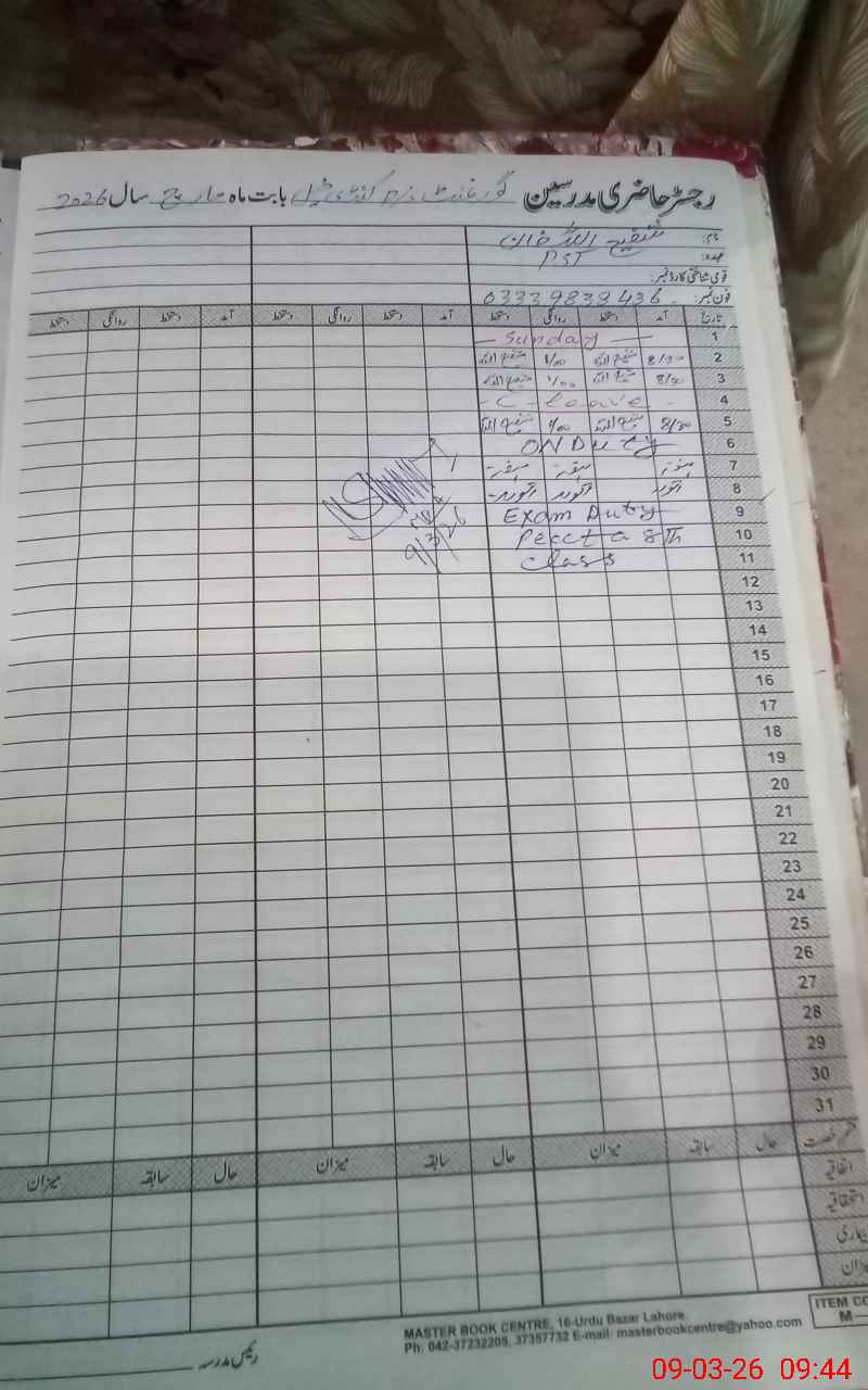 | 38**** | Sh**** Ul**** Kh**** | PST Science/Maths | Regular | 0 | 0 | 0 | 0 | 0 | 0 | 0 | 0 | 0 | Exam Duty |