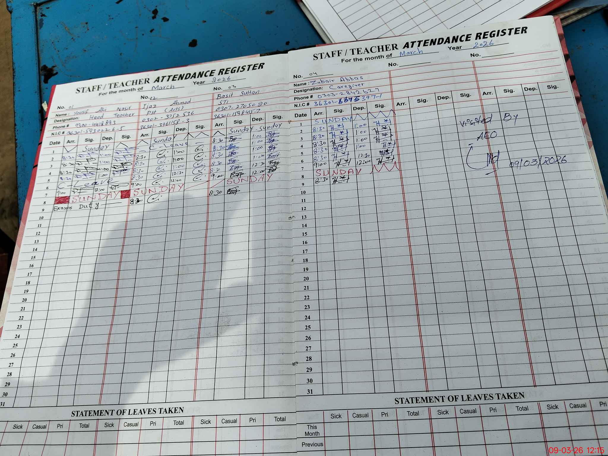 | CNIC | Full Name | Designation | R/C | Absence During Last Calender Month |
