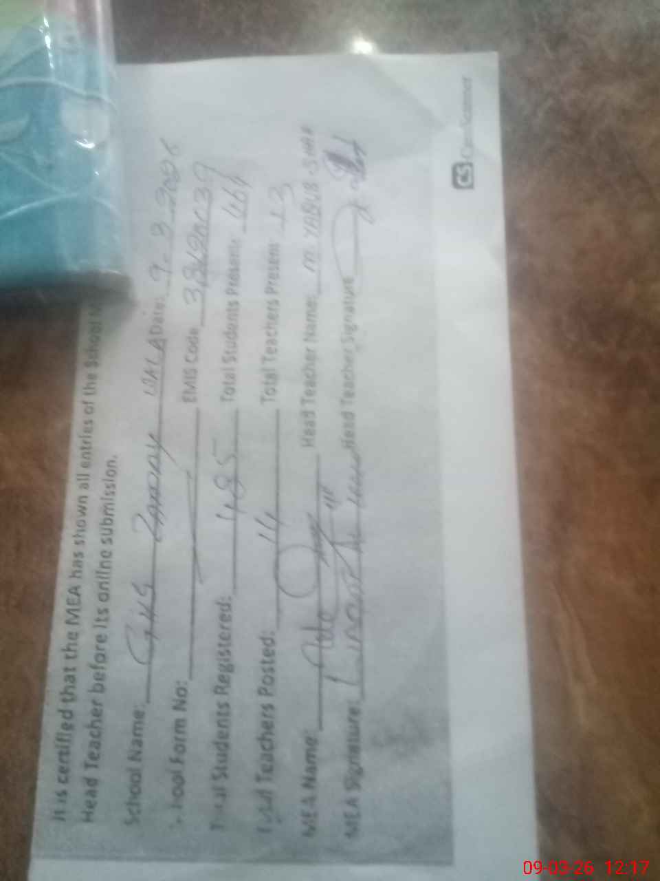 | Attendance Register | Head Teacher | MEA with School | Visit Proof |
