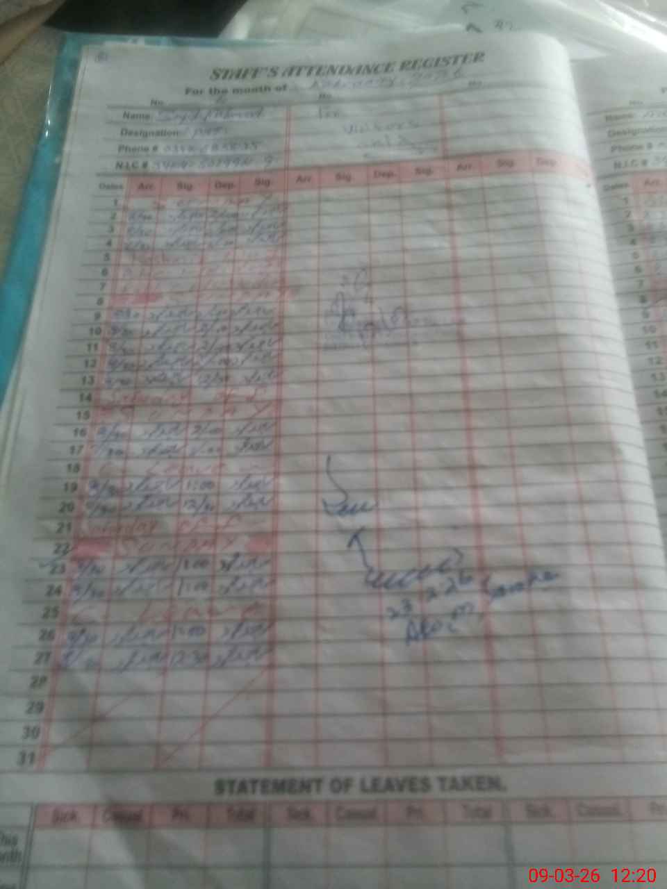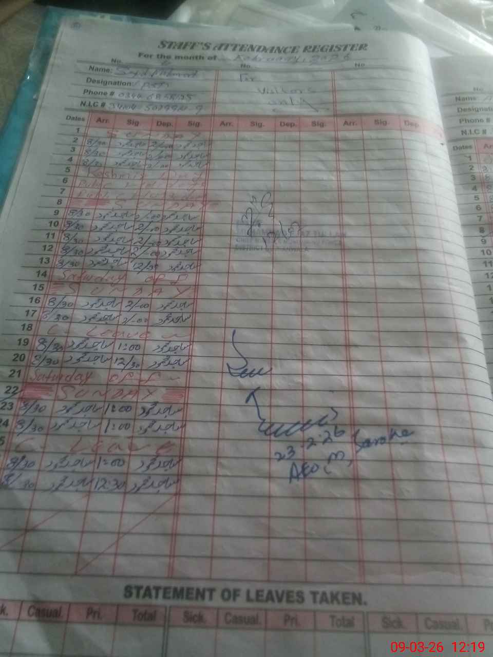 | CNIC | Full Name | Designation | R/C | Absence During Last Calender Month |