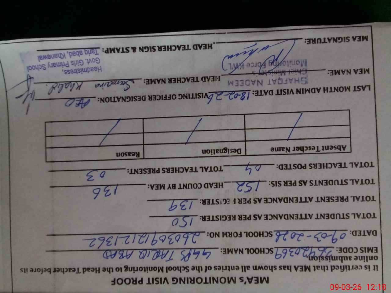 | Attendance Register | Head Teacher | MEA with School | Visit Proof |